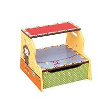Step stool in 4 Lil Monkeys Motif. This item is screen printed on all panels and has storage. Your little one will have fun counting these adorable monkeys in vibrant primary colors. The screen print brings to life a playful scene with cheerful little monkeys creating a fun and comfortable nursery. The assembled dimensions: 12.8 " by 13.4 " by 11 ".