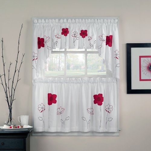 About CHF Industries CHF Industries, based in New York, is known for its home textile products and is the largest private-label supplier of retail-specific bedding products. CHF offers a diverse range of window products like panels, valances, shades, kitchen tiers, and even window hardware. CHF innovates with fashionable solutions such as energy-efficient interlined window panels, taking steps to introduce organic products to protect the environment. Tiered kitchen curtains measure 58W x 36L inches. Made from 100% polyester in your choice of color. Red color adds bold touch to windows. Machine-washable. Contemporary engineered floral applique design. 1.5-inch rod pocket accommodates 1-inch drapery rods. Part of the charming Poppy Garden Collection.