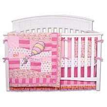 The Dr. Seuss Blue Oh!; The Places Youll Go 4-Piece Crib Bedding Set in Pink by Trend Lab succeeds in combining Dr. Seuss charm with beautiful embroidery, multiple textures and wonderful patchwork, providing your baby with a stylish and nostalgic nursery everyone will enjoy. This themed set features a framed quilt, 4-piece bumper, crib skirt and sheet.
