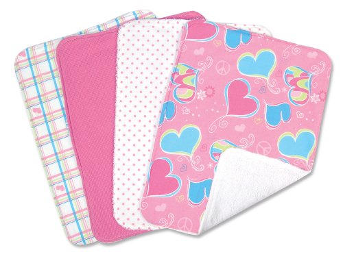 106688 Features: -Burp.-Pack of 4.-With velcro closure.-Burp cloth patterns include: Pink, turquoise and lime green swirled heart print, pink, turquoise and lime green plaid print on a white background, pink mini-dot and pink mini-waffle pique. Collection: -Groovy Love Collection.
