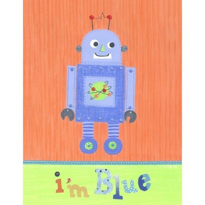 I'm Blue robot educational art teaches the color Blue. He loves to roll around spinning tales and telling good stories. 14" wide x 18" high. Pine wood frame with wrapped cotton canvas surface.