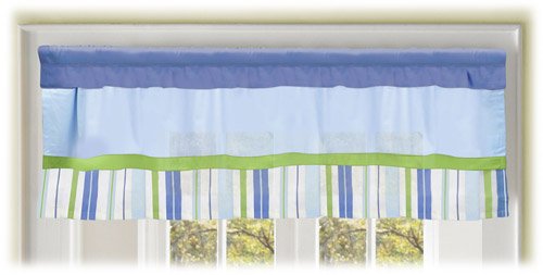 A perfect addition to your baby's nursery, the Confetti Boy Window Valance by Bananafish combines blues and lime green in a stripe print.