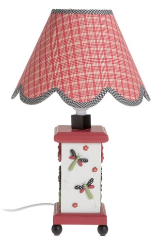 Dragonfly motif base, red gingham fabric shade. Takes up to a 40 watt, standard sized bulb (not included) and a 7 watt night light bulb (included). Measures 10 inches x 18 inches high.